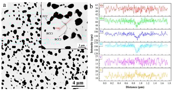 Figure 2a illustrates the SEM backscattered images of bulk NbMoTaWVTi alloy at different magnifications and elemental composition gradients along the drawn red line. It is clear that the sintered bulk alloy consists of a white matrix phase (BCC1), a black precipitated phase (FCC), and a few gray intergranular phases (BCC2). The average size and volume fraction of FCC particles are measured to be 0.64 μm and 16.1%, respectively. The thickness of BCC2 phase is measured to be about 60~250 nm, and the volume fraction of BCC2 is estimated to be about 3%. The chemical compositions of the matrix phase and the precipitated phase are determined by the EDS quantitative analysis. The results shown in Table 1 indicate that the BCC1 phase of the NbMoTaWVTi HEA is depleted of Ti, and has nearly equivalent amounts of all the other elements, while the precipitated phase basically contains Ti and O. However, the BCC2 phase is too small to be determined by the EDS quantitative analysis. Therefore, line scanning across grain boundaries is carried out to identify the chemical distribution of BCC2 phase. The results shown in Figure 2b indicate that the chemical composition of BCC2 phase is close to BCC1, except that it is slightly depleted of W, Mo, and Ta. It can be speculated that the formation of BCC2 results from the slightly inhomogeneous distribution of alloying elements at the grain boundaries of sintered HEA.