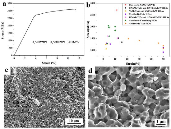 where and are the atomic weight and density of element i, respectively. The relative density is calculated to be 96.75%. Furthermore, the microhardness of bulk NbMoTaWVTi HEA is measured to be 786 HV, which is larger than 510 HV of the as-cast NbMoTaWVTi HEA []. Figure 4a shows the compressive engineering stress–strain curve of the sintered HEA specimen. The alloy exhibits compressive yield strength of 2709 MPa, fracture strength of 3115 MPa, and total fracture strain of 11.4% at ambient temperature.
