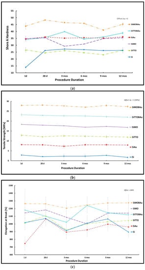 Additionally, for the tensile strength of samples, the difference between the means were significantly different (F (5, 55) = 10.093, p < 0.0005, η2 = 0.478), respectively. A Bonferroni post hoc test revealed a significant difference in the means of the tensile strength samples 0.607 (day 1 and 3 month; p < 0.10); 0.756 (day 1 and month 4; p < 0.010); 0.996 (day 1 and 12 months; p < 0.0001), one month and 12 months an increase of 0.592 (p < 0.007), month 9 and 12 a reduction in −0.756 (p < 0.10). However, the interaction effect between the tensile strength samples and the procedure time (F (25, 55) = 1.593, p = 0.076, η2 = 0.420) revealed non-statistical significance. Post hoc Bonferroni results disclosed a statistical significance between procedure time 1 month and samples (Si and SiMOBAu) mean reduction of 0.978 (p < 0.039); month 12 and sample (Si and SiAu) mean reduction of 1.244 (p < 0.010); month 12 and sample (SiAu and SiTTO, SiAu and SiMO, respectively) mean increment of 0.980 (p < 0.047) and 1.099 (p < 0.021), respectively.