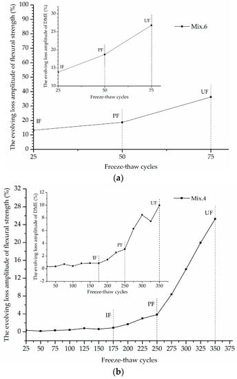 The DME and flexural strength were measured at each step (every 25 cycles) and the loss rates were calculated to plot their dependence on the freeze-thaw cycles (L-C curve), as presented in Figure 8. The loss in these material properties increases with the freeze-thaw process, which is treated as the working state of ECC mixtures. The ultimate freeze-thaw bearing capacity of each ECC mixture, expressed by the maximum bearable cycles, is recorded at the end of the freeze-thaw test. It is observed that Mix. 2, 4, 9, 13 and 15 with various volume fractions of PVA fiber reinforcement provide the outstanding resistance to the freeze-thaw exposure, since their engineering properties evaluated herein lose out slowly and the ultimate failure occurs after 300 cycles at least. On the other hand, the mixtures without fibers (Mix. 6) exhibit sharp reductions in the flexural strength and DME with the ascending freeze-thaw cycles.
