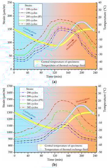 The IF and PF identified using M-K criterion are plotted in the evolving loss amplitude of flexural strength and DME of typical ECC mixtures, as shown in Figure 9. The strain variation curves of Mix. 9 under freeze-thaw cycles around the frost-induced failure points are shown in Figure 10. Each of the freeze-thaw cycles is divided into cooling and heating phase according to the different temperature variance tendency. The water transformation into ice accompanied by a volume expansion causes the hydraulic pressure in the cooling phase [,]. Besides, the osmotic pressure is built up as the response to the movement of supercooled gel water from the non-frozen sites to the ice bodies [,]. These freezing-induced pressures are among the driving forces for the volumetric change gauged inside the specimen. Assuming that all the pores are filled with water, the volumetric change is mostly related to the freezable water quantities. The water-freezing effect parameter η is proposed herein to model the volumetric change of ECC specimen in a single freeze-thaw cycle, which is formulated by time integration at a volume unit: