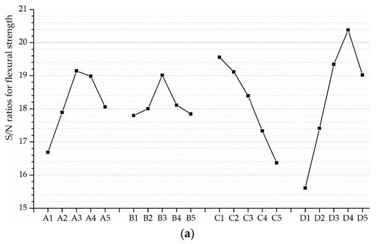 S/N ratios for: (a) Flexural strength; (b) IF index; (c) PF index; (d) UF index.