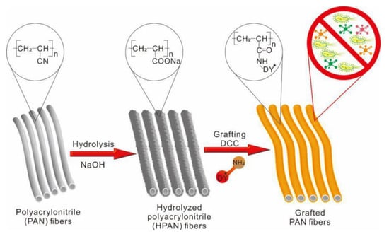 Polyacrylonitrile (PAN) fibers are one of the most common synthetic fibers and have attracted considerable interests because of their unique properties, including low density, good thermal insulation, soft-feel, excellent mechanical properties, and high durability. PAN fibers have been widely used as a precursor for carbon fibers [,,], or absorption substrates []. Many methods have been reported to modify the surface of PAN fibers, such as plasma treatment [], ultrasonic impregnation [], and biological enzymes treatment []. However, these techniques require pre-treatments, and the modification only last for short duration. Also, the enzyme treatment requires high purity of the enzymes which is challenging.