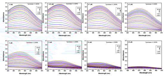 The UV absorption spectra of tyrosinase and thiosemicarbazone compound DY1–DY7 were tested using the L-DOPA method. All compounds exhibited satisfactory activity, and the experimental results are shown in Figure 2. For comparison purposes, the absorbance at 475 nm as a function of scan time was plotted, as shown in Figure 3.