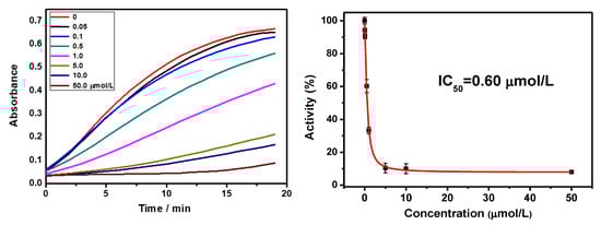 UV absorbance value versus time at 475 nm and semi-inhibitory IC50 curve of DY6 (blank control reagent is 1% DMSO).
