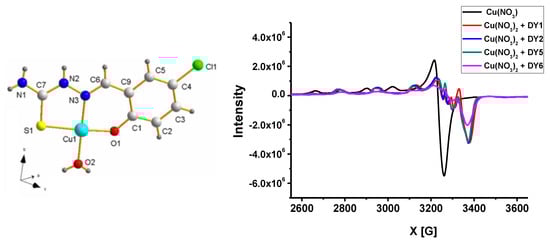 The single-crystal structure of DY5–Cu (II) compound (CCDC: 1030350) [] and the EPR spectrum of the DY1–Cu (II), DY2–Cu (II), DY5–Cu (II), and 6–Cu (II) complexes (ethanol, 2.5 mM).