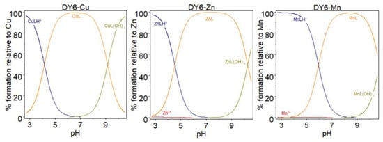Figure 6 shows that the complexes mainly exist in the form of CuLH, ZnLH, and MnLH, when DY6 is mixed with Cu2+, Zn2+, and Mn2+, respectively, at low pH. However, with increasing pH, deprotonation occurred, and the formation of derivatives such as CuL, ZnL, and MnL appeared at a pH 3–10, pH 4–10, and pH 4–10, respectively. Thus, the system mainly existed in the form of CuL, ZnL, and MnL. At higher pH, OH- bound Cu2+, Zn2+, and Mn2+ appeared, which were mainly CuL(OH), ZnL(OH), and MnL(OH).