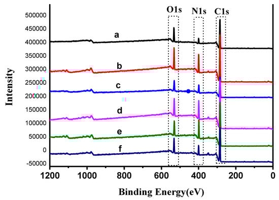 XPS spectra of: (a) Original PAN fiber; (b) DY1–PAN fiber; (c) DY2–PAN fiber; (d) DY4–PAN fiber; (e) DY5–PAN fiber; and (f) DY6–PAN fiber.
