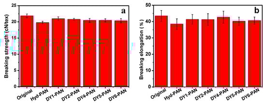 Comparison of breaking strength (a) and breaking elongation (b) of original PAN fiber, Hyd–PAN fiber, and DY1-, DY2-, DY4-, DY5-, and DY6-modified PAN fiber.
