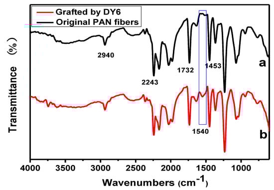 Figure 10 depicts the FTIR absorption spectra of the original PAN fibers (Figure 10a) and the DY6-modified PAN fibers (Figure 10b). The FTIR spectra of the original PAN fibers show the characteristic peaks at 2243 (γ C≡N), 1732 (γ C=O), and 1453 (δ CH2) cm−1, where γ represents a stretching vibration, and δ denotes a bending vibration. The absorption peaks of these characteristics are still present in the thiosemicarbazone graft sample, indicating that the method of small molecule branching treatment of thiosemicarbazone does not destroy or weaken the original molecular structure of the PAN fibers and that some features of the original PAN fibers are preserved. New absorption peaks were displayed at ~1540 (δ N–H and υ C–N, amide II) and ~3500 (δ –OH) cm−1, which indicate that the molecular modification of the surface of PAN fibers by thiosemicarbazone is feasible. The IR spectra further prove that modified acrylic fibers were successfully obtained.