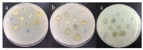 Antibacterial effect of different compounds on different bacteria: (a–c) the bacteriostatic effects of different compounds on E. coli, S. aureus, and B. subtilis. (Note: Marks 1, 3, 5, 7, and 9 on the plates are DY1, DY2, DY4, DY5, and DY6 with concentrations of 20 g/L; Mark 2, 4, 6, 8, and 10 on the plates are DY1, DY2, DY4, DY5 and DY6 with concentrations of 10 g/L; and Marks 0 and 11 on the plates are equal volume of DMSO solution).
