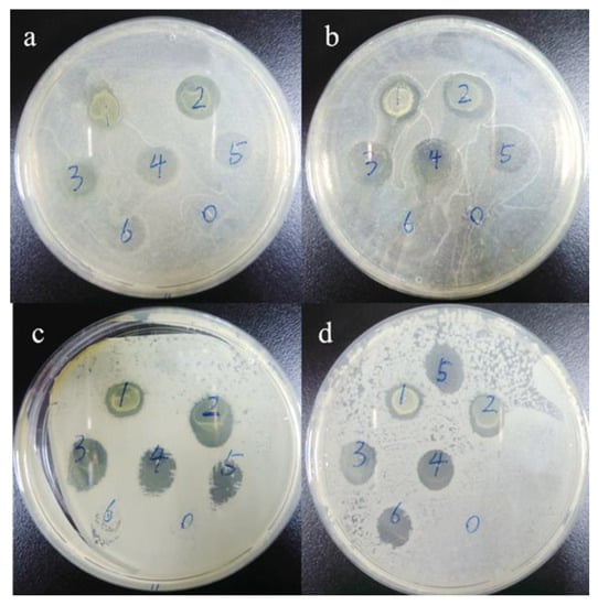 Antibacterial effects of different thiourea molecules: (a,c) the inhibitory effect of DY1 at different concentrations on S. aureus and B. subtilis, respectively; and (b,d) the inhibitory effects of DY6 at different concentrations on S. aureus and B. subtilis, respectively. (Mark 1, 10 g/L; Mark 2, 5 g/L; Mark 3, 2 g/L; Mark 4, 1 g/L; Mark 5, 0.5 g/L; Mark 6, 0.2 g/L; and Mark 0, DMSO).