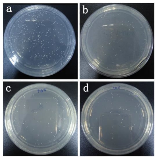 Antibacterial effect against S. aureus: (a) control sample; (b) after treatment with DY6 ay the concentration of 1.0 µM; (c) original PAN fibers; and (d) grafted DY6–PAN fibers.