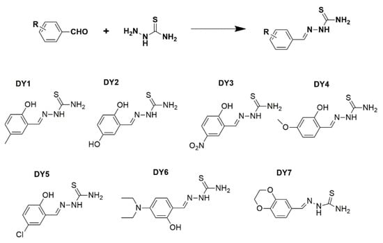 The thiosemicarbazone compounds were synthesized following a previously reported method [], and the schematic equation is presented in Scheme 1. Atomistic investigations were conducted on a Perkin-Elmer 2400 analyzer (PerkinElmer, Waltham, MA, USA). The mass spectroscopy (MS) data were recorded with the help of a Quattro II ESI mass spectrometer (Waters, Massachusetts, USA), and the ESI-MS spectral data were presented in Table 1. In a typical synthesis method, firstly, 0.92 g of amino thiourea (approximately 10 mmol) was dissolved in 10 mL water. Then, an equimolar concentration of salicylaldehyde or its derivative was added in 20–30 mL of ethanol. After compounding, distilled water and a catalytic amount of glacial acetic acid were added to the solution and mixed well. The mixture was heated and refluxed for 2–5 h. Then, the mixture was cooled to room temperature. After standing overnight at 4 °C, the crude product was obtained by suction filtration, and the product was further recrystallized from 50% ethanol to give the products DY1–DY7.
