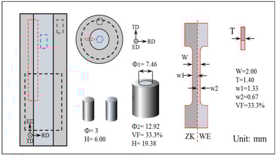 The compressive and tensile tests of the ZK60 sleeve, WE43 core, and ZK60/WE43 composite rods were carried out in this study, respectively. For the compressive tests of ZK60/WE43 composite rods, bars with a diameter of 12.92 mm and a height of 19.38 mm (height/diameter ratio: 1.5) were selected. Similarly, the ones with a diameter of 3 mm and a height of 6 mm were used to characterize the compressive properties of the ZK60 sleeve and WE43 core. The details of samples cutting for the compressive tests are manifested in Figure 1. For the tensile tests, the composite samples with a gauge length of 19 mm, a gauge width of 2 mm, and a thickness of 1.4 mm were prepared by setting the interface in the one-third position of the gauge width. For comparison, the tensile samples for the ZK60 sleeve and WE43 core were kept at the same geometry and dimensions as the composites. The quasi-static uniaxial compressive and tensile tests were accomplished in a universal material testing machine along the extrusion direction (ED). For each mechanical test, at least three specimens were repeated to characterize the compressive and tensile properties. To ensure accuracy, the load-displacement data were corrected by machine compliance from the load frame.