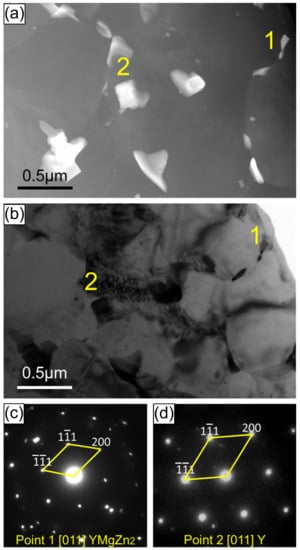 Figure 3a,b shows the STEM micrographs cross the diffusion zone of the ZK60/WE43 composite and the corresponding bright-field TEM micrographs. This indicates that the dynamic recrystallization occurred since there were quite a few grains with a low dislocation density mixed with other ones with a higher dislocation density from Figure 3b. Meanwhile, a homogeneous distribution of the rectangular-like particulate phase was observed in this area. These dispersed particles were identified as Zn- or Y-containing particles. Figure 3c,d shows the selected area electron diffraction (SAED) images of points 1 and 2 in the image, respectively. Point 1 was identified to be YMgZn2 phase with facecentered cubic (fcc) structure and point 2 was a Y-rich phase, which was also a typical fcc crystal structure. The presence of Zn and Y elements in the diffusion zone indicated the occurrence of interdiffusion phenomenon in the process of hot pressing diffusion and co-extrusion.