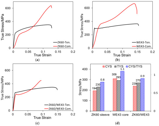 True tensile and compressive stress-strain curves of (a) ZK60 sleeve, (b) WE43 core, and (c) ZK60/WE43 bimetal composite along the extrusion direction. (d) Yield strength of the ZK60 sleeve, WE43 core, and ZK60/WE43 bimetal composite under compression and tension along the extrusion direction. Here Ten. and Com. represent the tension and compression, respectively, and CYS and TYS denote the compressive yield strength and the tensile yield strength, respectively.