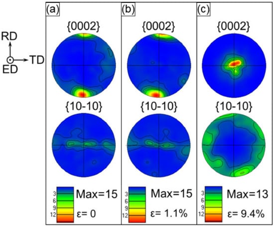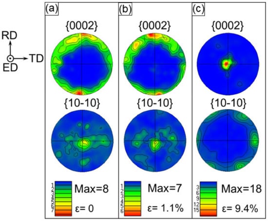 A texture evolution process of the WE43 core is shown in Figure 6. It is clear that the pole figure represents a larger extension of the basal texture towards the RD instead of TD for the WE43 core (i.e., most grains were orientated more randomly (Figure 6a) in comparison with that of the ZK60 sleeve (Figure 5a)). The low value of ~5 MRD in this pole figure indicates that the WE43 core showed a weak texture which is different from the magnesium alloys without RE such as the extruded AZ31, AM30, and ZK60 [,,,,,,,,]. It indicated that the addition of RE elements can induce the slip and result in a weaker texture. At a strain value of 1.1% (Figure 6b), basal {0001} poles still maintained a high intensity of ~8 MRD with one pole between ED and RD. With the increase of strain level from ε = 1.1% to 9.4%, most of c-axes rotated towards the compressive direction or ED. However, for some grains, their c-axes still remained in the initial direction due to the difficulty in forming twins in some grain orientation. Thus, a maximum intensity of ~9 MRD was attained, which was about half of that of the ZK60 sleeve (~18 MRD, Figure 5c).