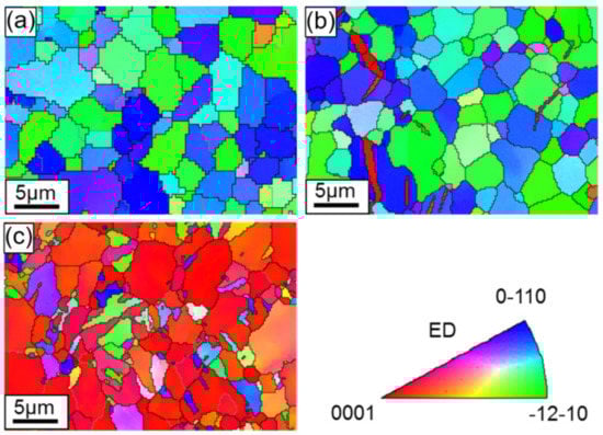 Inverse pole figure (IPF) maps are demonstrated in Figure 8, Figure 9 and Figure 10 for the ZK60 sleeve, WE43 core, and interface zone, respectively. The orientation of the local crystal lattice was exhibited via color in the IPF orientation maps in regard to the crystal reference frame (i.e., ED or compressive direction in this study), based on the color legend seen in these figures. From the IPF orientation maps of the initial undeformed alloy, an almost equiaxed and un-twinned grain can be seen with a dual grain size of ~1.2 µm for WE43 core and ~2.8 µm for ZK60, respectively, calculated by a linear intercept method. As extension twinning was not profuse in the yield state (1.1%), the IPF orientation maps showed little change in color, which was consistent with the pole figures shown in Figure 5b. The twined grains will be discussed in the coming section. The grain orientation in the ZK60 sleeve evolved dramatically, which is revealed by the color change of the IPF orientation map at a strain level of 9.4% (Figure 8c). The movement of extension twinning leads to the c-axis nearly parallel (with rotations of 86.3°) to the compressive direction. The extension twin zones exhibit red in the IPF orientation maps. Owing to the fast extension of these twins, it would sweep the entire grains with the increase of plastic strain.