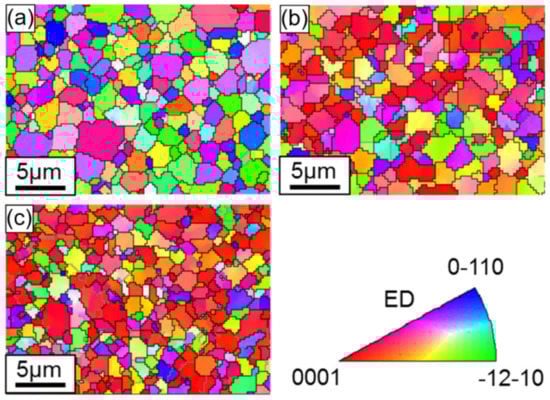 Currently, magnesium alloys are being applied as the structural materials in many important fields such as automotive, aeronautical, and space due to high specific strength and other outstanding properties [,,,,,,]. However, to further widen the application of wrought magnesium alloy products, one of the key challenges to be solved is yield asymmetry between tension and compression after thermo-mechanical processing [,,,,,,,]. That is, for extruded magnesium alloy rods, the yield strength in tension (TYS) is largely different from the yield strength in compression (CYS) in the extrusion direction (ED) [,,,,]. The origin of the yield tension-compression asymmetry is explained as follows: the presence of basal fiber texture causes {10-12}<−1011> extension twinning during compression along the extrusion direction, which is activated more easily than the tensile deformation in the highly extruded magnesium products. The polarity of {10-12}<−1011> extension twinning with a small critical resolved shear stress (CRSS) is one deformation mode activated more easily at room temperature. It indicates that, if {10-12}<−1011> twinning plays a crucial part during compression, the slip with a higher CRSS, such as prismatic <a> slip, can become the predominant mode of the Mg alloy rods during tension along the ED [,,,,,,,,]. Thus, yield asymmetry between tension and compression will be produced.