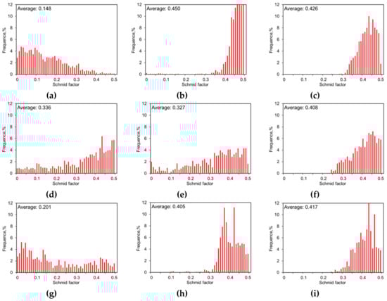 By developing a crystal plasticity model, Qiao et al. [] investigated the slip and twinning behavior of ZK60A during tension. For the stress along the ED, the prismatic slip becomes dominant. To verify this, Schmid factors (SFs) of the ZK60 sleeve relevant to the loading axis along the ED were calculated and Figure 11a–c presents the corresponding results for basal slip, prismatic slip, and extension twinning, respectively. The average SF of the basal slip approaches to ~0.15 (Figure 11a), suggesting that the basal slip is not easy to be motivated. That is, only if the external force is large enough and the resolved shear stress (RSS) surpasses the CRSS, the basal slip can be activated. Before the tensile yielding of the ZK60 sleeve sample, no rotation in the orientation of grains occurred, and the texture did not change obviously. The SF of the prismatic slip was ~0.45, which approaches the highest possible value of 0.5, suggesting that the prismatic slip is relatively easy to be activated. The prismatic slip becomes dominant during tension along the ED. Therefore, the tension along the ED has a higher yield strength. Generally, for the extruded Mg alloy (c/a = 1.624), the c-axis is in a tensile stress state when a compressive stress state is applied in the direction of the extrusion axis. Thus, the extension twinning {10-12}<−1011> was easily activated, and the extension twinning mode is a primary deformation mechanism during compression along the extrusion axis.