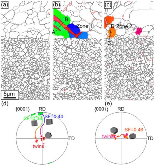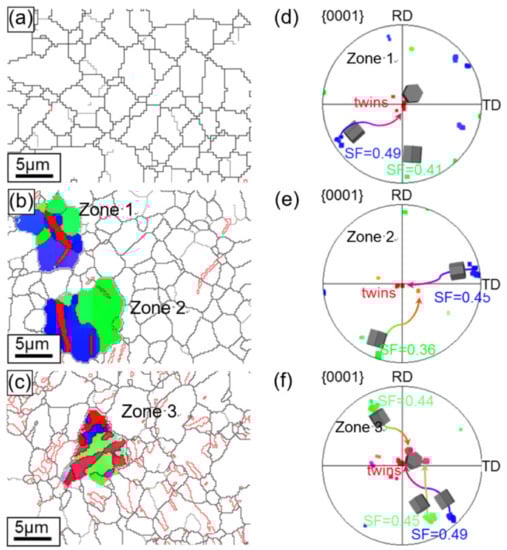 The grain boundary maps of the ZK60 sleeve with different compressive strain amounts along with three selected zones and the corresponding pole figures (PFs) are illustrated in Figure 12. The twins were not seen in the initial state (Figure 8a and Figure 12a), similarly to Figure 8. With increasing strain, {10-12}<−1011> extension twins began to form, grow, and coalesce. For the deformation twins in zone 1 of Figure 12b,d, a set of twins were produced from the grain boundary intersection and due to the mutual connection of multiple twins, twin chains or twin bands were formed with increasing strain. In zone 2 of Figure 12b,e, twin lamellae were formed due to the larger grain and the suitable deformation condition with respect to the compressive axis. To explain the mechanisms on the selection of specific twins, SF values were calculated and the active twin planes and their tracks were detected by HexaSchmid software []. As summarized in Figure 12d,e, the twinning first occurs in blue grains under compressive stress and then in green grains along the twinning plane and direction due to the higher SF values (0.45–0.49) of blue grains than those of the green ones (0.36–0.41). Further compression resulted in the amalgamating of pre-existing extension twins or the vanishing of twin boundaries. Even after the “ultimate” state, there were some untwined grains left mainly in the green grains in Figure 8c and Figure 12c.