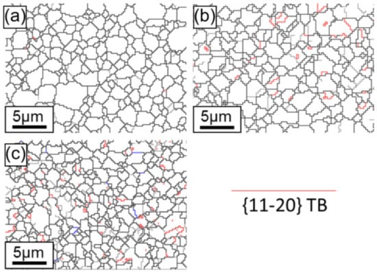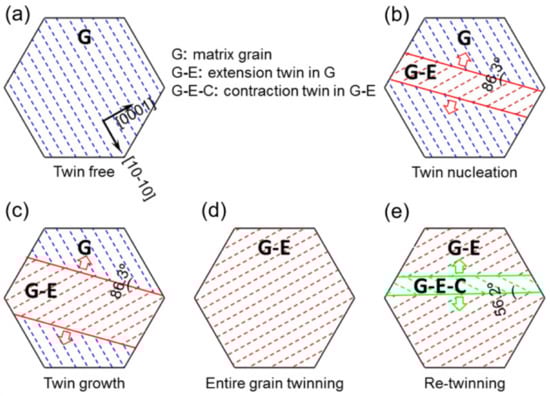 More details of the plastic deformation are illustrated in Figure 15, which originates from twinning and double twinning shown in Figure 14c. In the deformation process, twinning and double twinning occur in the following steps: twinning nucleation, twinning growth, entire grain twinning, and/or double grain twinning. All of them are related to the general glide-shuffle or shear-shuffle involving the slip of twinning dislocations. Initiated with an un-twinning area (i.e., matrix grain shown in Figure 15a), the grain begins to twin by the nucleation associated with the {10-12}<−1011> extrusion twinning only if the RSS of the Mg substrate is equal to CRSS for twin nucleation. Then the grain is divided into an un-twinning zone (matrix) and a twinning zone (twin), as shown in Figure 15b. Their crystallographic lattice, which is mirrored through the twin boundaries (TBs) equivalent to an 86.3° rotation to the c-axis in hexagonal close-packed (hcp) unit cell (or basal plane as demonstrated in the dotted lines in Figure 15). After twining nucleation, twin growth starts when the RSS of the Mg substrate surpasses the CRSS value (Figure 15c). Twinning growth occurs via the glide of twinning dislocations (TDs) of the substrate on the TB when the stress generated on TDs acts as the driving force at the TBs. Due to the twinning with polar property, the TDs can slip along the twinning direction. With increasing strain, the entire grain is twinned, along with the slip of TDs at the TB, where extension twins merge and twin boundaries disappear, as shown in Figure 15d. Double twinning, representing the activation of a twin within a twinned grain (Figure 15e), occurs after the grain becomes totally extension twinning. In this case, the c-axis is in compression stress condition while it is compressed along the ED. Accordingly, the contraction twinning {10-11}<10-1-2> is activated (Figure 15e), which represents {10-12}-{10-11} double twinning sequence.