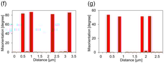 The microstructure in Figure 14a along with the corresponding IPF orientation maps in Figure 10a reveals that the extruded interface zone contains almost homogeneous as well as equiaxed grain structures with a mean grain size of ~3.1 µm, and it presents a representative basal texture, along with the c-axes of most grains presumably perpendicular to the ED on the ZK60 side. A relatively weak texture occurs on the WE43 side due to the fine equiaxed grain structure (~1.1 µm). Figure 14b shows the twin growth behavior in the selected grains after being compressed to yield point. The selected grains are explored and highlighted in Figure 14b. It is seen that, even though the green and blue grains displayed different SFs (0.38 and 0.44, Figure 14d) along the twinning plane and direction, a set of twins were formed from grain boundary intersection and multiple twins could link mutually to form twin bands or chains with increasing strain in the ZK60 side. A few lenticular twins appeared, with a few peaks of ~86° observed in the misorientation outline presented in Figure 14f, corresponding to the number of twin boundaries intersected by line A-B in Figure 14b. Meanwhile, in the WE43 side, the fraction of extension twins is much lower than that in the ZK60 side, even lower than that in the WE43 core (Figure 13) in the same deformation state. However, it is noted that some narrow banded contraction twins were formed within the amalgamated extension twins in the ZK60 side (Figure 14c,e). To verify the formation of contraction twins, the misorientation across these twin boundaries was ascertained by the outline along the direction determined by the dotted line C-D in Figure 14c. The numbers of peaks in Figure 14g matched that of twin boundaries shown in Figure 14c and all the misorientation peaks were ~56°, verifying that the contraction twins are present. It is the result of the stress concentration occurring at the interface while maintaining a high bonding strength.