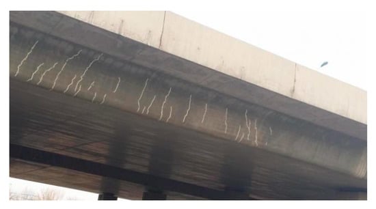 T-beams are widely used in urban bridges in China due to their strong bearing capacity. And with the effects of long-term load, a large number of cracks often occur on the surface of T-beams. However, the impact of cracks within limit sizes on the bearing capacity of T-beams is not obvious; T-beams with small cracks are regarded as healthy components of bridges. Initially, the width and depth of cracks were not strictly managed by corresponding code, accordingly, plenty of unsafe bridges have emerged in coastal areas, of which the service lives are less than 10 years [,,].