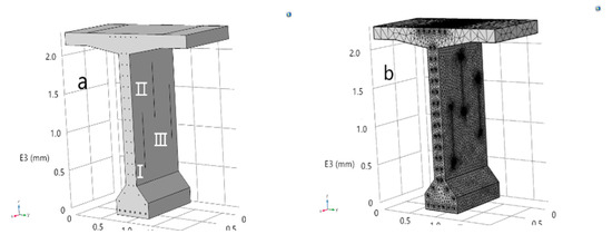 Figure 1 shows that numerous vertical cracks have emerged at the web position of the beam under the coupling effect of load and environment, and the action of dead load from bridge superstructure and live load will cause the continuous derivation of cracks. Additionally, the diffusion rate of chloride ions in cracks will increase simultaneously, which accelerates the corrosion process of reinforced concrete. To simulate the diffusion process of chloride ion in a T-beam with cracks, three finite element models A, B, and C are established using the dilute material transfer module in COMSOL Multiphysics.