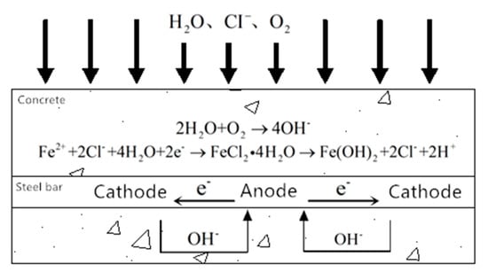 With the FE model, the time for the chloride ion to reach the critical concentration on the surface of the steel bar, i.e., the time of depassivation can be obtained, and subsequently the bending capacity and the shear capacity of the steel bar can be calculated. Besides, the adhesive force between the reinforcement and the concrete is not considered, because the chloride ion and the reinforcement are prone to electrochemical reaction in humid environment, as shown in Figure 4.