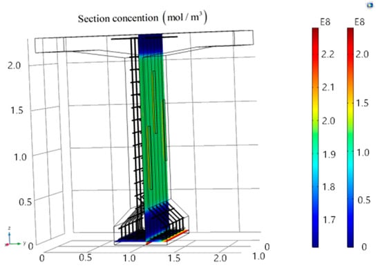 Cracks are numbered L1–L9, and after establishing the whole model with solid elements, mesh the model. In addition, to guarantee the calculation accuracy and the fast calculation speed, a top-down mapping grid is adopted in the model, where the grids are dense near cracks and reinforcement while others are relatively sparse. The maximum unit size is 4 mm and the unit number is 23,457. The concrete surface directly in contact with air is set as the Dirichlet boundary, and the other surfaces are set as Neumann boundaries. The chloride ion concentration field is randomly distributed along the beam in practice. Consequently, it is quite difficult to accurately obtain the chloride ion concentration at various beam positions, as the change trend of the concentration in the environment is always related to the random factors such as humidity and temperature. The chloride ion concentration on the beam surface is based on [] in this paper, which is 228 mol/m3 (only applicable to bridges in offshore areas), and the chloride ion concentration in the beam center is set to 0 without considering chloride impurities in cement and mortar. The FE (Finite element) model is based on Fick’s second law.