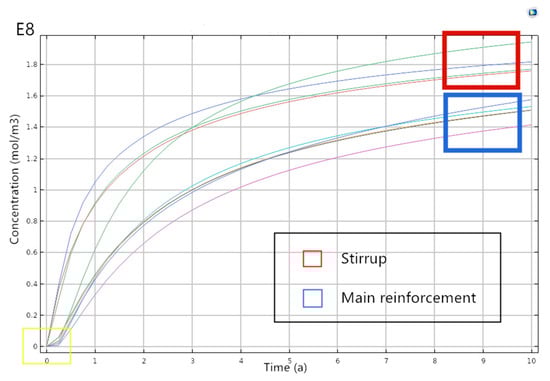 In order to analyze the chloride ion concentration on the reinforcement surface to explore the initially corrosion time of steel bars, by setting two-dimensional profiles on both the stirrup surface and the main reinforcement surface, we can obtain three curves of chloride ion concentration, changing over time at the corresponding crack locations of stirrups and main reinforcement, shown in Figure 6. The ordinate means the chloride concentration on the surface of the reinforcement, and the abscissa denotes the corrosion time of chloride ion on the T-beam. The concentration change trend is shown in the blue wireframe in Figure 6; specifically, the chloride ion concentration on the stirrup surface near cracks gradually increase with time. Whereas no significant chloride ion concentration changes happen on the main reinforcement surface at early stages, as shown in the yellow wireframe. In addition, the increase of chloride ion concentration on main reinforcement surface requires enough corrosion time, the reason may lie in the distance between main reinforcement and cracks, with which the early transmission would spend more time. Generally speaking, the growth rate of chloride ion concentration on stirrup surface is greater than the one on the main reinforcement surface.