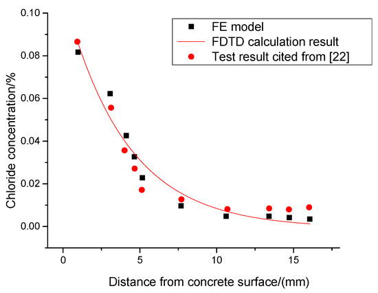 To guarantee the accuracy of the FE model, chloride concentration of various model areas, test results by Scott Thompson Shill [] and FDTD calculation results are compared together. Figure 7 shows the comparison results: The concentration of different layers in concrete shows an exponential decay trend, and the concentration attenuation trends of the three are similar, which guarantees the model rationality.