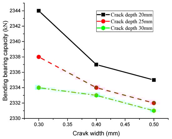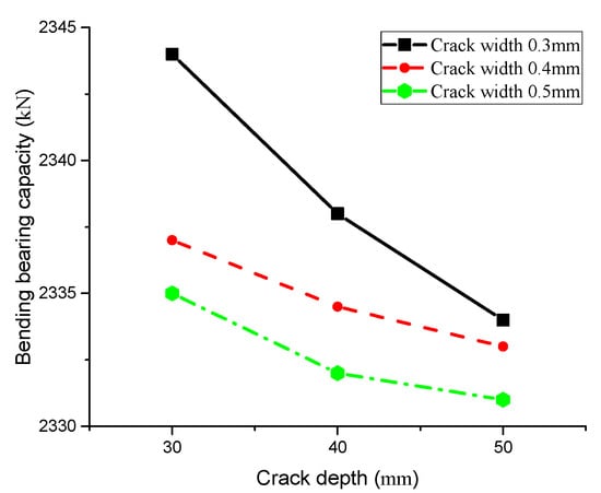 Figure 8 depicts that deeper cracks result in lower bending capacity of the T-beam and vice versa. In addition, bending capacity of the T-beam is susceptible to crack width. With the same crack depth, greater crack width leads to lower bending capacity, indicating that crack sizes will directly affect the diffusion rate of chloride ions, and even the bending capacity of beams. Figure 9 illustrates the effect of crack width on bending capacity of T-beams at different depths. Comparing results between the changing trend of bending capacity in Figure 8 and Figure 9 shows that, although both width and depth of crack will affect the bearing capacity of the T-beam, the influence of crack width is obviously greater than that of crack depth.