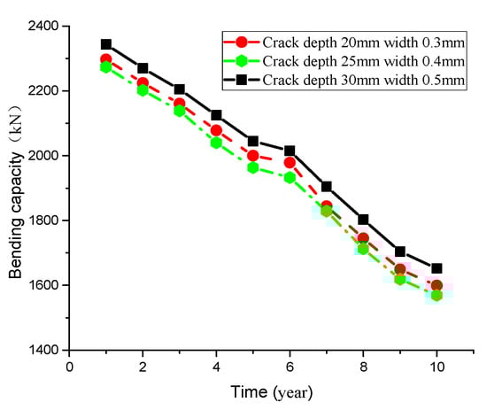 Furthermore, the corrosion time of chloride ion is also a key factor. The decrease in bending capacity of T-beams is not obvious as the depassivation time is not long. While Figure 10 shows the bending capacity changing trend of T-beam under different crack widths and depths over time, specifically, the bending capacity of T-beam drops with time and the curve roughly follows the trend of linear change.