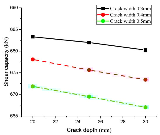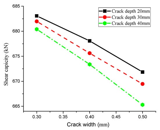 Figure 11 shows the relationship between crack depth and shear capacity with the same crack width. In general, deeper cracks lead to faster corrosion rates of chloride ion on the T-beam, and shear capacity of stirrups gradually reduced with a relatively slow change trend. Additionally, great differences exist among the steel bar shear capacity with different crack widths, indicating that both crack width and depth have an impact on the shear capacity of steel bars. Figure 12 depicts the influence of crack width on shear capacity of reinforcement. To conclude, crack width is inversely proportional to the shear bearing capacity (i.e., wider cracks result in lower shear bearing capacity), and the rapid reduction rate of shear capacity illustrates that the influence of crack width on stirrup shear bearing capacity is greater than that of crack depth.