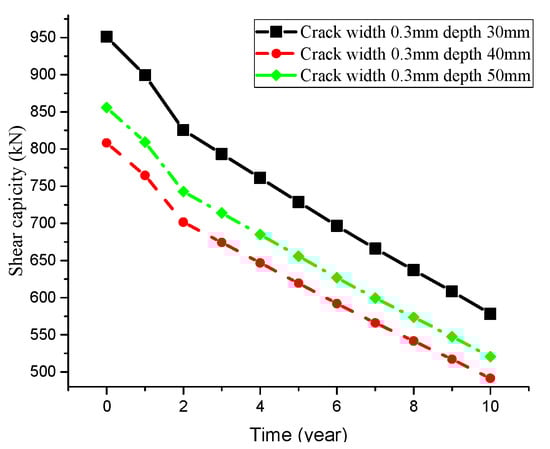 Figure 13 describes the change of the T-beam shear capacity over time with different crack depths and widths. Generally speaking, longer corrosion time of chloride ion on the T-beam will result in lower shear capacity. Besides, crack width and depth will also affect the shear capacity of the T-beam, which is consistent with the above analysis results.
