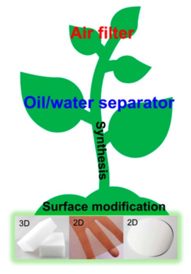 - Lee, Y.S.; Lim, Y.T.; Choi, W.S. One-step Synthesis of Environmentally Friendly Superhydrophilic and Superhydrophobic Sponges for Oil/water Separation. Materials 2019, 12, 1182. [Google Scholar] [CrossRef] [PubMed]