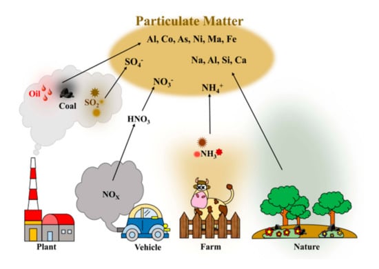 Schematic illustration for particulate matter (PM) generated from various sources.