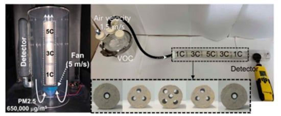 (Left) An image of the operation of an air cleaner equipped with CHAF-1C/3C/5C for the removal of PM2.5. (Right) Images of an air filtration system equipped with CHAF-1C/3C/5C/3C/1C and single cylindrical hollow air filters (CHAFs) (CHAF-1C, 3C, and 5C) for the removal of VOCs (HCHO). Reproduced with permission from []. Copyright 2020 American Chemical Society.