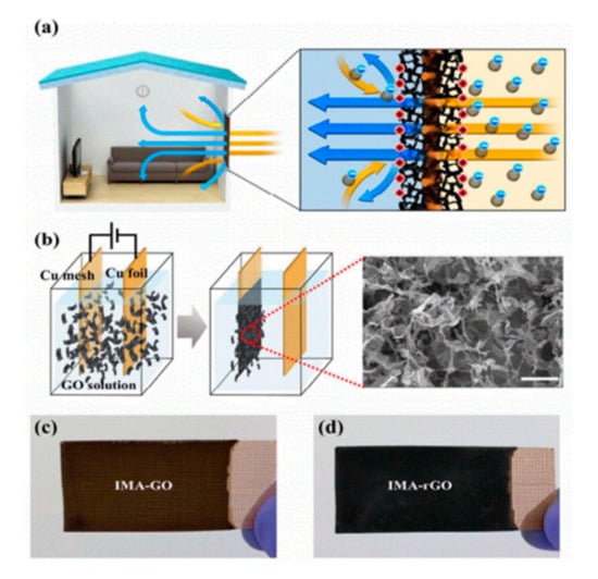 PM2.5 removal mechanism, fabrication process, and the structure of reduced graphene oxide (GO)-based air filter: (a) the schematic illustration of PM removal by a reduced GO-based air filter through electrostatic attraction force; (b) the schematic illustration of the fabrication process for a reduced GO-based air filter. SEM image of the GO-coated surface (scale bar: 50 μm). Optical image of (c) GO-coated Cu mesh and (d) reduced GO-coated Cu mesh after (c) before and (d) after the thermal reduction process. Reproduced with permission from []. Copyright 2018 The Royal Society of Chemistry.
