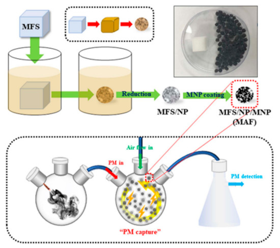 Air and water pollution have been growing and challenging concerns worldwide because of rapid civilization and industrialization. Air pollution from particulate matter (PM) has become one of the most severe global challenges in the 21st century. Particularly, PM has been a major national, environmental, and social issue in developing countries due to serious long-term effects on the ecosystem as well as on human health [,,,]. According to a report from the World Health Organization (WHO), more than 80% of the world’s population in 2018 was exposed to air quality levels that exceed WHO limits []. Worldwide air pollution tremendously endangers human health because of poisonous pollutants such as heavy metals, toxic gases, and microorganisms [,]. To protect the public from severe air pollution, air filters are highly necessary and have been intensively studied in recent years. Ideal air filters should have the ability to effectively remove PM particles while allowing air to pass through them easily. Conventional air filters have low specific surface areas and poor surface affinity for PM because air filters are usually made of micrometer-sized polyethylene (PE) and polypropylene (PP) fibers that insufficiently interact with PM. The materials employed for conventional air filters insufficiently interact with PM because conventional air filters are usually made of micrometer-sized polyethylene (PE) and polypropylene (PP) fibers. Conventional air filters have low specific surface areas and poor surface affinity for PM. To achieve an air filter with high performance, various materials have been developed, including synthetic polymers, natural polymers, nanocarbons, inorganics, and organic/inorganic hybrids [,,].