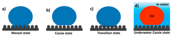 Water contact angles (WCAs) smaller or larger than 90° are classified as “hydrophilic or hydrophobic”, respectively. WCAs smaller or larger than 10° or 150° are classified as “superhydrophilic or superhydrophobic”, respectively. When the substrate is tilted and the droplet starts to roll off, the tilted angle is called the sliding angle (SA). The CA explains the static behavior of the surface, and the SA explains the dynamic property of a droplet on the surface, determining the overall surface wettability of the materials [,,]. Thus, surface wettability is evaluated by testing the water or oil CA and SA. The wettability behavior of a droplet on a flat surface can be described by the Young wetting model [,]. However, this model is not suitable for rough surfaces because rough surfaces have a great effect on the wettability of materials in addition to their chemical composition []. The wettability behavior of a droplet on a rough surface can be explained by the Wenzel state, transition state, and Cassie state (Figure 7) [,,,]. In the Wenzel state, a liquid droplet can fill the vacancies of hierarchical rough structures, and then the droplet wets the rough surface (Figure 7a) []. Thus, the rough surfaces show high adhesion behavior to a droplet at the Wenzel states. However, when the droplet has difficulty filling the vacancies of the rough structures and the surface repels the droplet, the droplet can stay on top of the rough surface with the assistance of air cushions trapped beneath the droplet, which is known as the Cassie state (Figure 7b). Thus, the rough surfaces show low adhesion behavior to a droplet at Cassie states. In the transition state, the droplet partially fills the vacancies of the rough surface (Figure 7c) [,,,,,,,,,]. The trapped air cushion can minimize the contact area between the rough surface and the droplet in the Cassie state, resulting in excellent water repellency. This Cassie mechanism can be extended to an underwater oil droplet onto the surface (solid/water/oil phases) (Figure 7d).