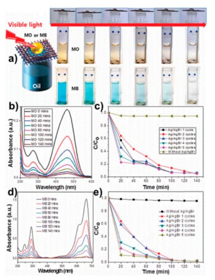 - Hu, C.; Lan, Y.; Qu, J.; Hu, X.; Wang, A. Ag/AgBr/TiO2 visible light photocatalyst for destruction of azodyes and bacteria. J. Phys. Chem. B 2006, 110, 4066–4072. [Google Scholar] [CrossRef]