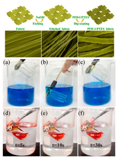 Several groups have utilized a dip-coating method to endow fabrics with superhydrophobic/superoleophilic and superhydrophilic/superoleophobic properties. This dip-coating method is a simple way to prepare fabrics with special wettability. Zhang et al. employed a dip-coating method to prepare superhydrophobic cotton fabrics containing ZnO-NPs and PS on the surface of cotton fabric []. Moreover, these fabrics showed excellent wettability properties for the oil/water separation with WCA over 153°. Another superhydrophobic cotton fabric was also prepared by dipping the bare fabrics into a TiO2 solution followed by coating with stearic acid to generate a dual structure onto the surface of the fabrics []. Li et al. proposed a one-step dip-coating method using a mixture of PDMS and SiO2 dispersion to fabricate superhydrophobic fabric and utilized it for oil/water separation []. Both dip-coating and etching methods can be simultaneously applied to pristine fabrics to create superhydrophobic fabrics. Zhang et al. fabricated superhydrophobic/superoleophilic polyethylene terephthalate (PET) fabric possessing a dual surface morphology through the etching fibers with alkali and followed by dip-coating the PET fabric into a solution of fluorinated alkylsilane (Figure 10) []. The pristine PET fabric, consisting of microscale fibers with smooth surfaces, was etched by NaOH, resulting in enhanced roughness and reduced fiber diameters (Figure 10, top). After coating the polymer and fluorinated alkylsilane onto the etched PET fabric, the resulting fabric was mounted on a glass bottle and fabricated as an oil skimmer container (Figure 10, bottom). Oil/water separation and collection processes were performed by superhydrophobic fabric-capped device. This device showed a stable separation efficiency as high as 99% even after 30 cycles. Similarly, superhydrophobic fabrics with rough surface structures were fabricated by the alkali etching of fibers, followed by hydrophobic coating with mercapto silanes []. The superhydrophobic fabrics exhibited excellent chemical stability against various chemicals, such as acid, base, salt, acetone, and toluene and were utilized for oil/water separation.
