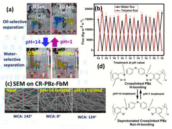 - Li, J.-J.; Zhou, Y.-N.; Luo, Z.-H. Smart Fiber Membrane for pH-Induced Oil/Water Separation. ACS Appl. Mater. Interfaces 2015, 7, 19643–19650. [Google Scholar] [CrossRef] [PubMed]