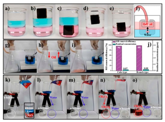 Superhydrophobic and superhydrophilic sponges can be utilized to purify aqueous pollutants during the continuous separation of three multiphase solutions (light oil/water/heavy oil). Choi et al. developed an anti-overturn Janus sponge (AJS) with amphiprotic characteristics, such as hydrophobic and hydrophilic parts (Figure 13) []. The AJS can float or can be submerged on or under water, respectively, because of its amphiprotic property. The AJS can be synthesized by the successive coating of magnetic NPs (MNPs), Pdop, and ODA on an MF sponge. The hydrophobic ODA was coated only onto the upper half of the AJS, leading to the formation of an AJS consisting of hydrophilic (bottom) and hydrophobic (top) parts. The hydrophilic part remained submerged under water, while the hydrophobic part always floated on water. The AJS exhibited excellent adsorption characteristics for aqueous pollutants during fast oil/water separation because the AJS also possessed a hydrophilic part (MFS/MNP/Pdop). The AJS can remain at each interface in three multiphase solutions and adsorb aqueous pollutants due to its amphiprotic property (Figure 13a–e). The AJS rapidly separated an oil/water mixture using a pump as well (Figure 13f–j). A pant-like structure that was divided into two branches could continuously separate an oil/water mixture (light oil/water/heavy oil) and rapidly purify contaminated water during the separation (Figure 13k–o).