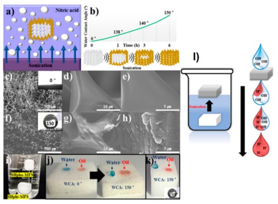 - Zhang, J.; Seeger, S. Polyester materials with superwetting silicone nanofilaments for oil/water separation and selective oil absorption. Adv. Funct. Mater. 2011, 21, 4699–4704. [Google Scholar] [CrossRef]