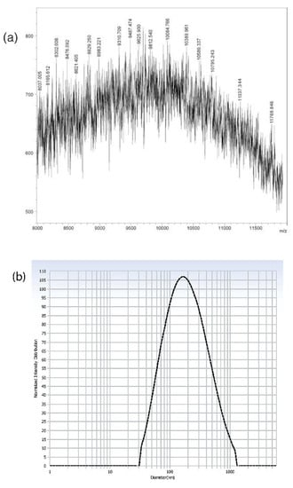MALDI-TOF MS analysis showed that molecular weight of P4LDN was 9373.613 Da, which was nearly identical to the theoretical mass (i.e., 9372.86 Da) (Figure 1a). 1H-NMR spectra showed peaks mainly at three regions: 2.1–1.1, 4.2–2.7, and 8.6–7.8 ppm. Three peaks between 2.1 and 1.1 ppm can be attributed to methylene protons of lysine marked “b”, “c”, and “d” (Figure 1b). The chemical environment provided by the nearby amino group shifts methylene proton “‘e” signal towards 2.7–2.9 ppm. The peak at 4.2 ppm represents the proton in the CH group attached to an amine, marked as “a”. The peak at 13.5 ppm may be attributed to the proton of NH2 marked “h”. The peaks in the region 8.9–7.5 ppm represent the amino protons of the lysine sidechain, which is “g” in the figure.
